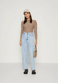 Μακρυμάνικο ριμπε σώμα σε ανοιχτό καφέ, με ψηλό λαιμό. Συνδυάζεται με ψηλόμεσα ανοιχτό μπλε τζιν παντελόνια.