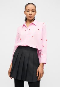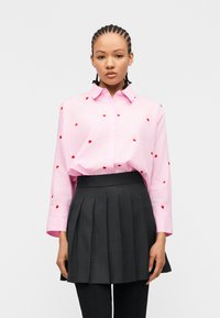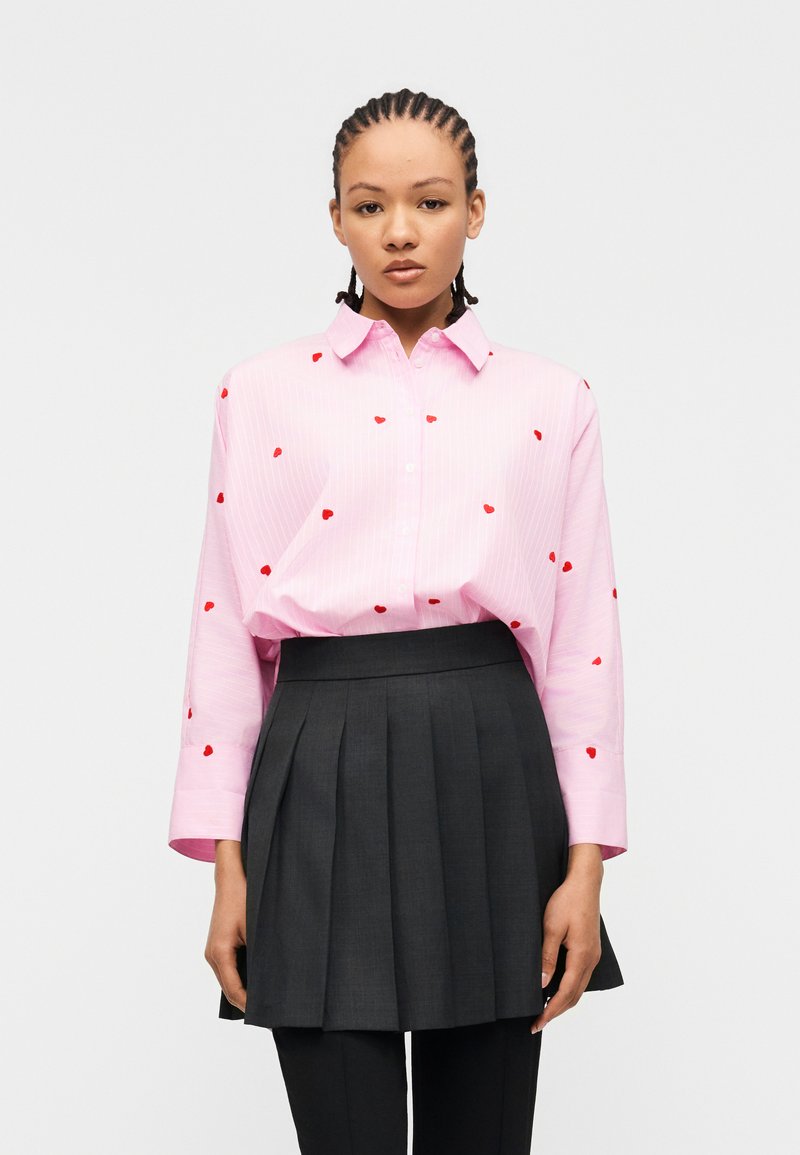 Γυναίκα με πλεγμένα μαλλιά, που φοράει ροζ πουκάμισο με κόκκινες καρδιές, σκούρα πλισέ φούστα και μαύρο παντελόνι, μπροστά σε ανοιχτό φόντο.