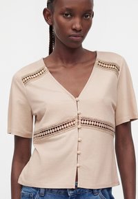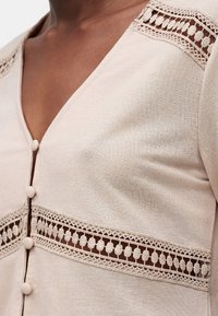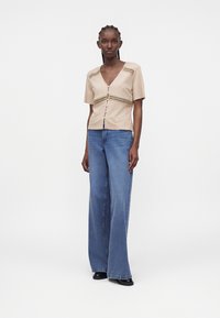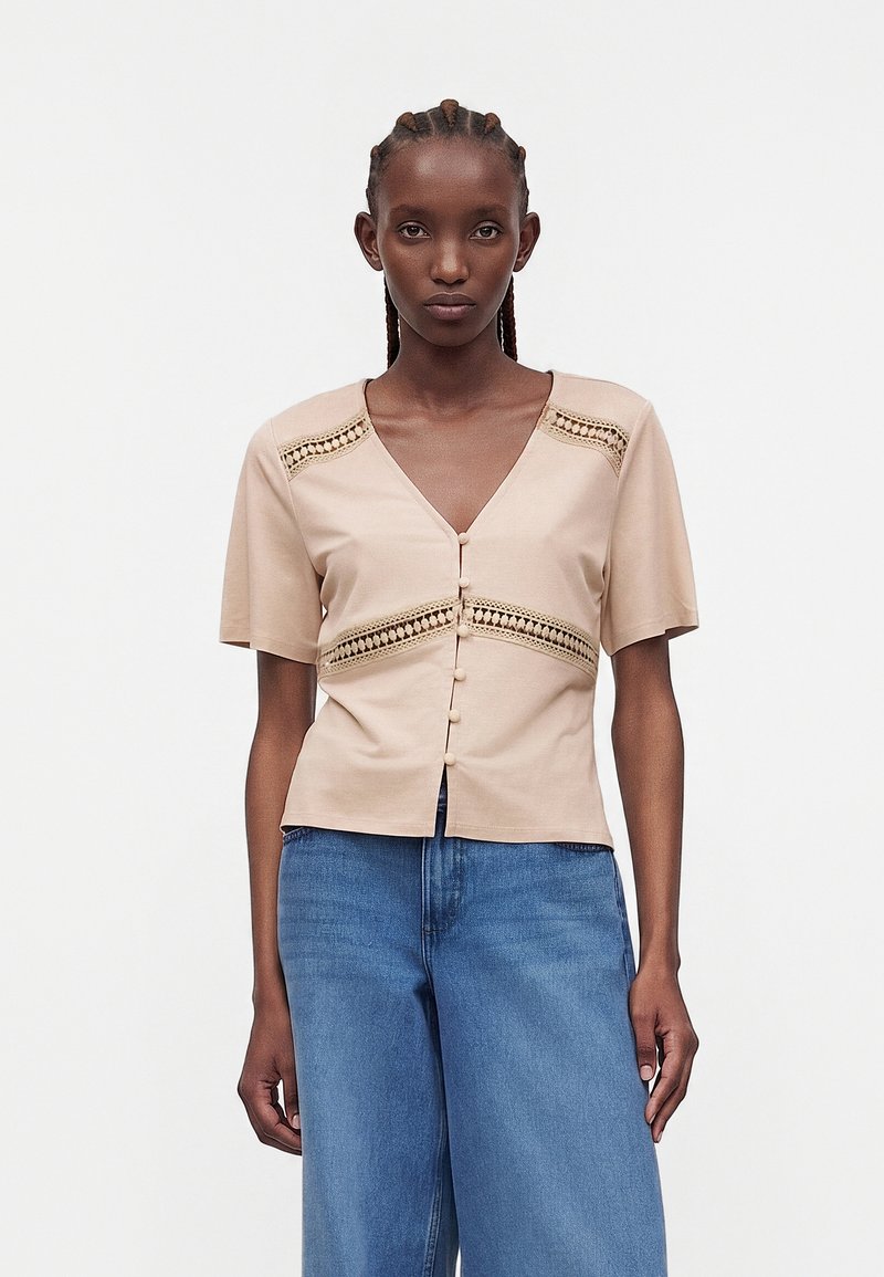 Γυναίκα με πλεξούδες φοράει μια μπεζ κοντομάνικη πουκάμισο με κουμπιά και δαντέλα και μπλε ψηλόμεσο τζιν, στέκεται μπροστά σε λευκό φόντο.