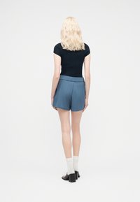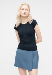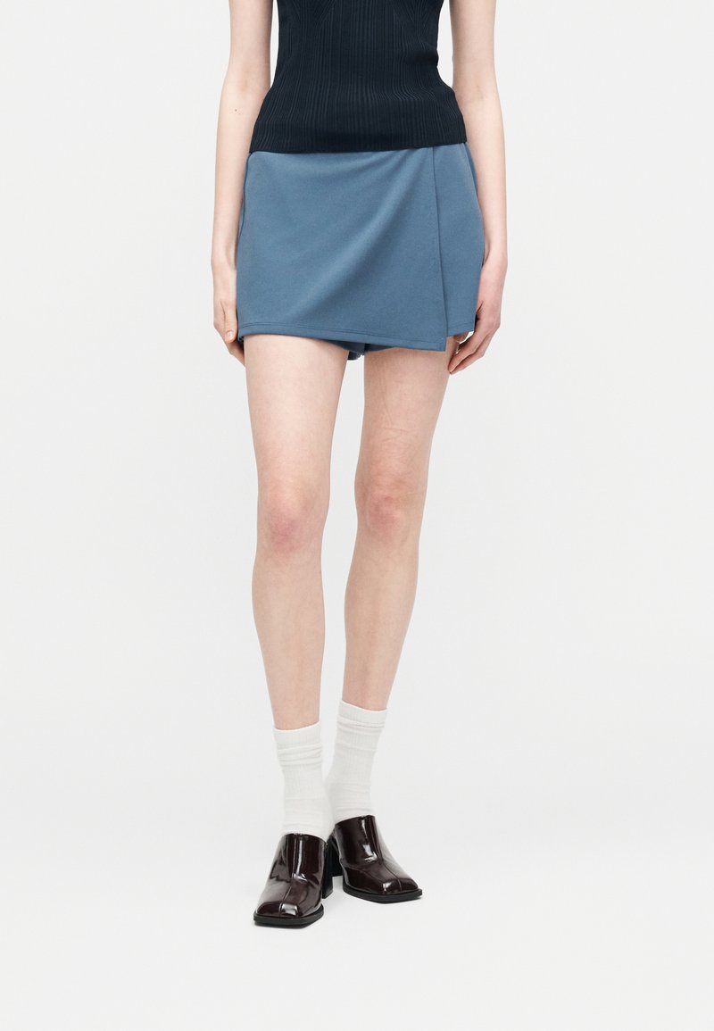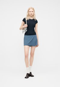 Γυναίκα που φοράει μπλε μίνι φούστα τύπου wrap, μαύρο αμάνικο τοπ, λευκές κάλτσες και σκούρα καφέ γυαλιστερά loafers, στέκεται μπροστά σε απλό φόντο.