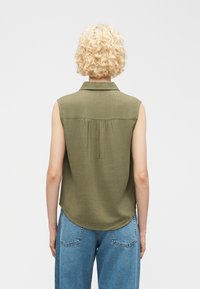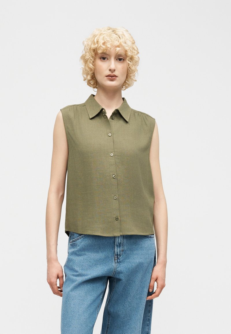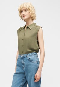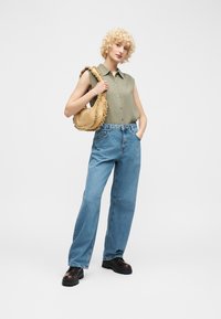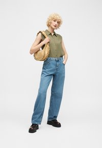 Γυναίκα με σγουρά ξανθά μαλλιά που φοράει μια γιλέκο ελιάς πράσινο πουκάμισο χωρίς μανίκια με κουμπιά και ανοιχτό μπλε τζιν, όρθια μπροστά σε ένα απλό φωτεινό φόντο.