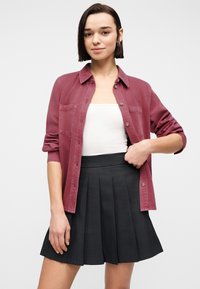 Γυναίκα που φοράει ένα σκούρο κόκκινο πουκάμισο με κουμπιά πάνω από ένα λευκό τοπ και μια πιετέ μαύρη φούστα, στέκεται μπροστά σε ένα απλό φωτεινό φόντο.