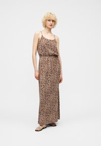 Ξανθιά άτομο που φοράει αμάνικο, με μοτίβο, μακρύ φόρεμα σε καφέ και μπεζ αποχρώσεις, στέκεται μπροστά σε απλό φωτεινό φόντο, φορώντας μαύρα σανδάλια.