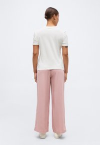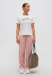 Γυναίκα που φοράει λευκό t-shirt με το κείμενο «VINTAGE» και σχέδιο με λεοπάρ, συνδυασμένο με ανοιχτό ροζ παντελόνι, στέκεται μπροστά σε μια απλή φόντο.