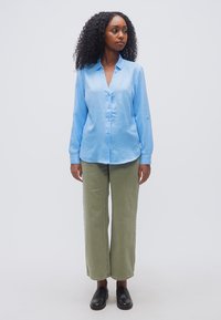 Γυναίκα με σγουρά μαλλιά φορώντας ανοιχτό γαλάζιο πουκάμισο με κουμπιά και ελαιδί παντελόνι, στέκεται μπροστά σε ένα απλό φωτεινό φόντο.