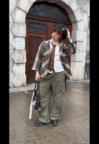 • Νεαρό άτομο με κοντά βαμμένα μαλλιά που φοράει πράσινο μπερέ, καρό σακάκι, λευκό πουκάμισο, γραβατά με σχέδια, χακί παντελόνι, κρατώντας μια μαύρη τσάντα έξω.