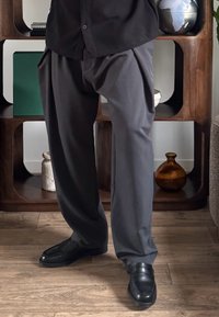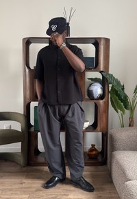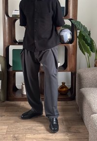• Άτομο φοράει φαρδιά γκρι παντελόνια, μαύρο πουκάμισο με κουμπιά και μαύρα παπούτσια και στέκεται μπροστά σε ξύλινο ράφι με υδρόγειο και φυτό κοντά.