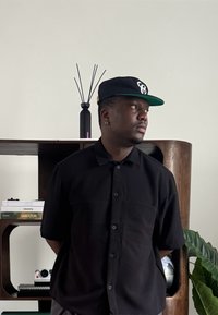 • Άνδρας με μαύρο σκουφάκι, μαύρο κοντομάνικο πουκάμισο και χαλαρά τζην σορτς στέκεται με τα χέρια στις τσέπες σε ένα σύγχρονο δωμάτιο.