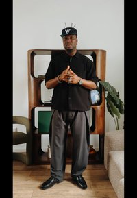 • Άνδρας με μαύρο σκουφί, μαύρο μπουφάν και γκρι φαρδιά παντελόνια στέκεται μέσα σε δωμάτιο με τα χέρια στις τσέπες κοντά σε ξύλινο ράφι και πράσινη καρέκλα.