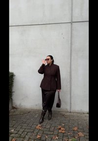 • Γυναίκα που φοράει σκούρο καφέ σακάκι, μαύρη μίντι φούστα με δαντέλα, μπότες που ταιριάζουν και κρατάει μία σκούρα καφέ τσάντα, μπροστά σε γκρι τοίχο.