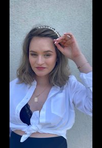 • Λευκό πουκάμισο με κουμπιά, δεμένο στη μέση, αποκαλύπτοντας ένα μαύρο δαντελένιο bralette από κάτω. Μαύρη στενή φούστα που τονίζει την καμπύλη κοιλιά. Στεφάνι από πέρλες.