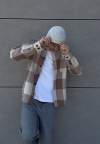 • Νέος άνδρας προσαρμόζει γκρι πλεκτό σκουφί, φορά καφέ και μπεζ καρό μπουφάν, λευκή μπλούζα και μπλε τζιν, στέκεται μπροστά σε γκρι τοίχο.