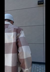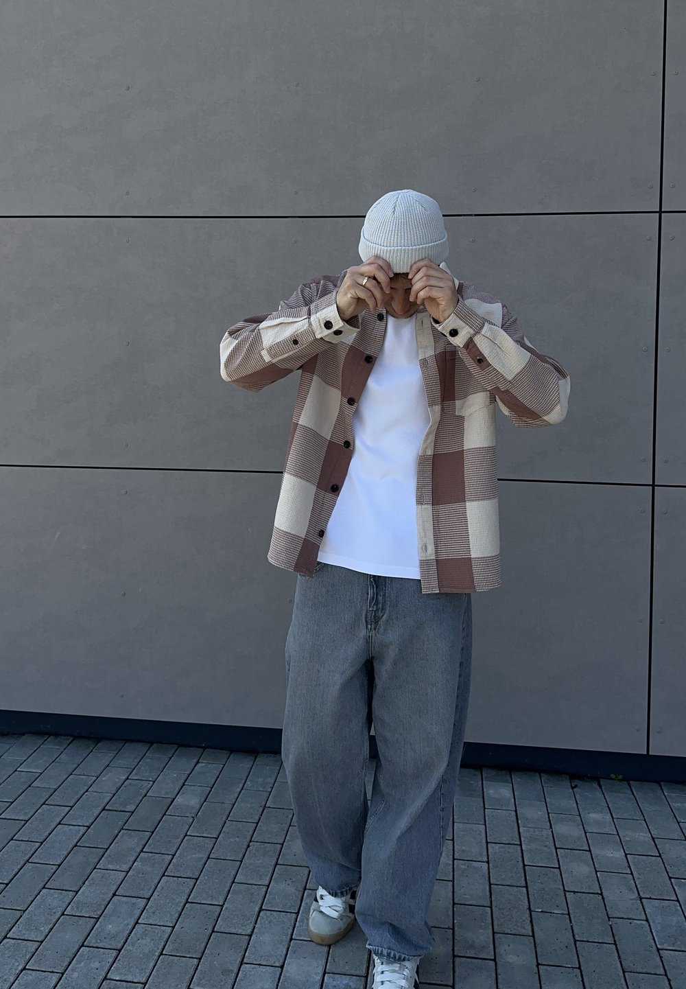 • Άτομο που διορθώνει λευκό πλεκτό σκουφάκι, φοράει φαρδιά μπεζ και καφέ καρό μπουφάν, λευκό πουκάμισο, φαρδιά γκρι τζιν και άσπρα αθλητικά παπούτσια, στέκεται σε πλακόστρωτο έδαφος.