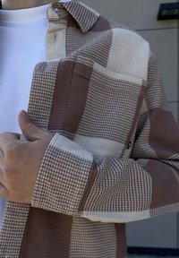 • Άτομο φοράει μια υφασμένη, καρό μακρυμάνικη πουκάμισα σε μπεζ και καφέ αποχρώσεις πάνω από ένα λευκό μπλουζάκι, κρατώντας το μπροστινό μέρος του πουκαμίσου κοντά στο στήθος.