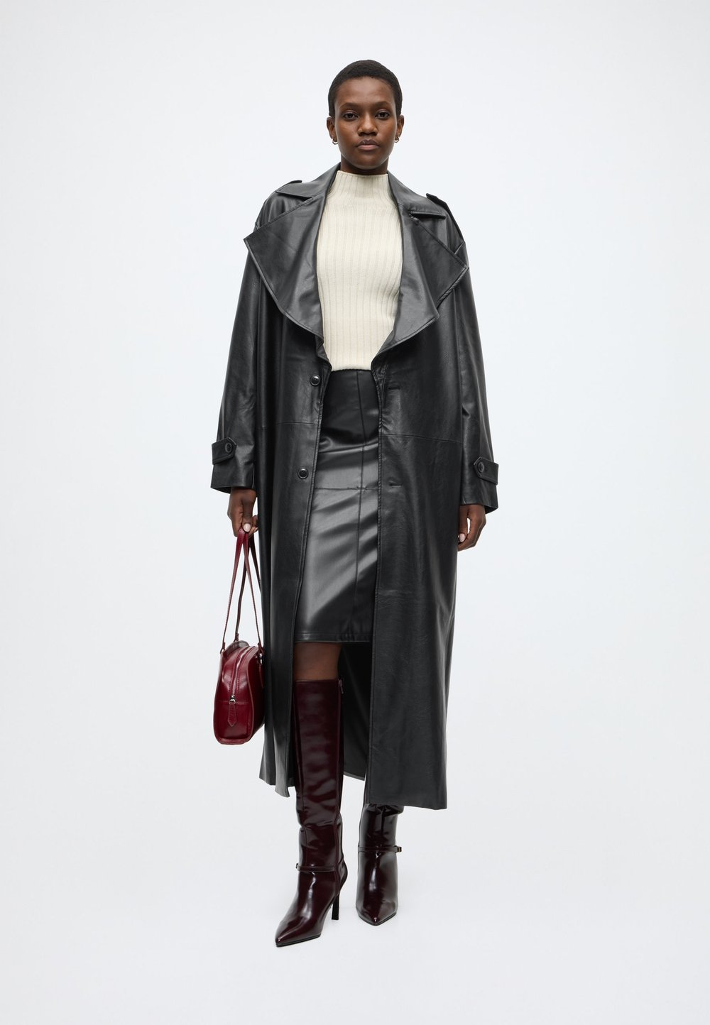 Μαύρο δερμάτινο μακρύ παλτό, μπλε ριγέ πουκάμισο, φαρδιά μαύρα παντελόνια και άσπρα αθλητικά παπούτσια. Μινιμαλιστική μαύρη τσάντα χιαστί με καπιτονέ σχέδιο. Ρυθμός σε γκαράζ από σκυρόδεμα.