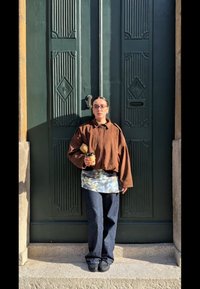 • Άτομο με καφέ μπουφάν, φλοράλ φούστα πάνω από σκούρο τζιν, κρατώντας ένα κίτρινο τσαντάκι χειρός και μια κούπα καφέ για πακέτο, στέκεται δίπλα σε μια πράσινη πόρτα.