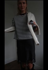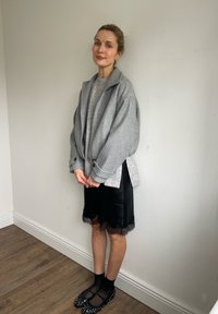• Γυναίκα στέκεται σε εσωτερικό χώρο μπροστά σε απλό τοίχο, φορώντας γκρι φαρδιά ζακέτα με φερμουάρ, μαύρη φούστα με δαντέλα, μαύρες κάλτσες και μαύρα παπούτσια με καρφιά.