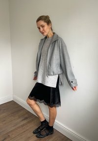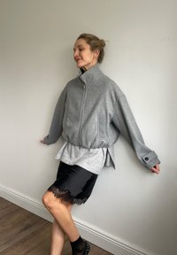 • Γυναίκα που φοράει γκρι μπουφάν με φερμουάρ πάνω από γκρι χαλαρό τοπ, μαύρη φούστα με δαντέλα, διάφανα μαύρα καλσόν και μαύρα άνετα παπούτσια με τρουκς, στέκεται μέσα σε εσωτερικό χώρο.