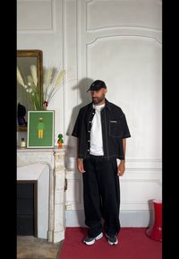 • Μαύρο κοντομάνικο πουκάμισο με λευκή ραφή και μπροστινή τσέπη, φορεμένο πάνω από λευκό μπλουζάκι, συνδυασμένο με μαύρο παντελόνι με φαρδιά γραμμή.