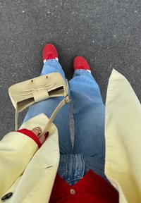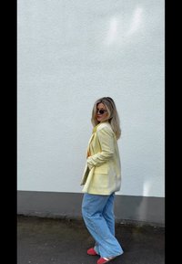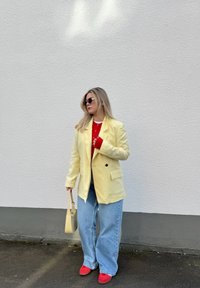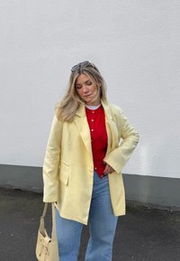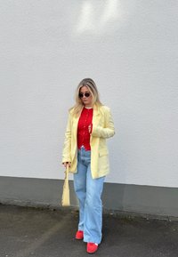 • Γυναίκα φοράει κίτρινο σακάκι, κόκκινο πουλόβερ, ανοιχτό μπλε φαρδιά τζιν, κόκκινα παπούτσια, γυαλιά ηλίου και κρατάει μπεζ τσάντα, στέκεται μπροστά σε λευκό τοίχο.