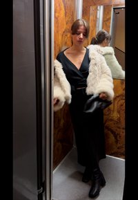 • Γυναίκα που φοράει λευκό μπουφάν από συνθετική γούνα πάνω από μαύρο τοπ και φούστα, στέκεται σε ασανσέρ με ξύλινους τοίχους και καθρέφτη.