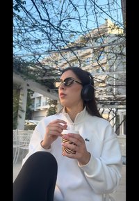 • Γυναίκα που φοράει γυαλιά ηλίου και ακουστικά κρατάει ένα φλιτζάνι καφέ και στέκεται σε μια βραχώδη παραλία με δασωμένους λόφους και γαλάζιο ουρανό στο φόντο.