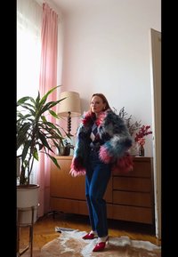 • Γυναίκα με πολύχρωμο παλτό από μακριά γούνινα νήματα, πουλόβερ με ρόμβους, σκούρα τζιν και κόκκινες γόβες, στέκεται πάνω σε χαλί από δέρμα αγελάδας σε ένα φωτεινό δωμάτιο με φυτά.