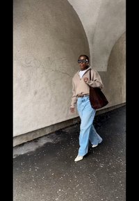 • Γυναίκα που περπατά φορώντας μπεζ ζακέτα με φερμουάρ, ανοιχτό μπλε τζιν με φαρδιά πατζάκια, λευκά μυτερά παπούτσια, μεγάλα σκουρόχρωμα γυαλιά ηλίου και κρατώντας μία σκούρα καφέ σουέντ τσάντα.