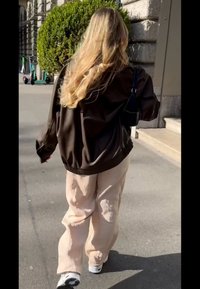 • Καφέ δερμάτινο υπερμεγέθες μπουφάν, άσπρη μπλούζα με λεπτομέρειες δέσιμο, μπεζ παντελόνι και μαύρη τσάντα σε στυλ χειρός με δύο μπροστά τσέπες. Αστική ατμόσφαιρα.