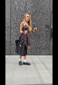 • Μαύρο φόρεμα με λουλούδια σε κόκκινο χρώμα και λευκές βούλες; φαρδιά φούστα. Μαύρα παπούτσια με λευκές κάλτσες. Ορατό τατουάζ στο χέρι. Σκούρα τσάντα.