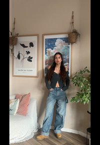 Τζάκετ από τζιν, καφέ κασκόλ με φούντες, μαύρο φαρδύ παντελόνι και χοντρές μαύρες μπότες. Εσωτερικός χώρος με τέχνη, φυτά και μαξιλάρια.
