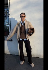 • Καφέ πλεκτή ζακέτα με κουμπιά, μαύροι φαρδιοί παντελονιών και μαύρη τσάντα. Λαμπερά loafers ξεκουράζονται σε κυβόλιθους; ξύλινη πόρτα στο παρασκήνιο.
