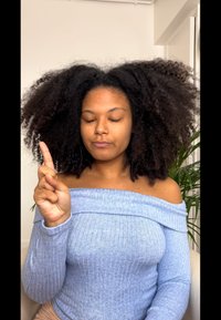 • Ανοιχτό μπλε ριμπ αoff-the-shoulder μπλούζα με μακριά μανίκια, συνδυασμένη με ψηλόμεσα ξεθωριασμένα μπλε τζιν, μπροστά από έναν υφασμένο μπεζ τοίχο.