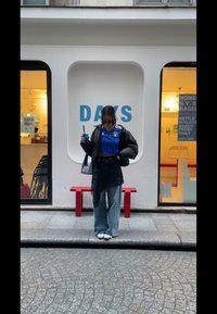 • Γυναίκα με μπλε κοντομάνικο πουκάμισο και τζιν, κρατώντας ένα ποτό, στέκεται δίπλα σε κόκκινο παγκάκι έξω από καφέ με πινακίδα "DAYS" και μενού με μπέιγκελ στον τοίχο.