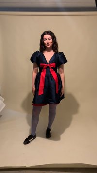 • Γυναίκα με σκούρα σγουρά μαλλιά που φοράει φόρεμα σκούρου μπλε χρώματος με φουσκωτά μανίκια και μεγάλο κόκκινο φιόγκο, κρατώντας το κάτω μέρος του φορέματος και κοιτάζοντας προς τα κάτω.