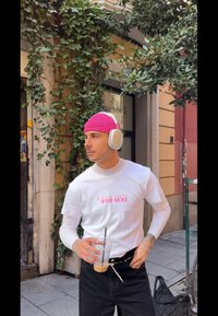 • Άτομο καθισμένο σε ένα παγκάκι, φορώντας λευκό μακρυμάνικο πουκάμισο με ροζ κείμενο, μαύρο φαρδύ παντελόνι και ροζ σκουφί, κρατώντας ένα ποτό.