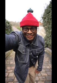 • Άνδρας με κόκκινο σκουφάκι, γυαλιά και σκούρο τζιν μπουφάν στέκεται έξω δίπλα σε σκάλες και σε πράσινο τοίχο καλυμμένο με κισσό, με τα χέρια του σταυρωμένα μπροστά.