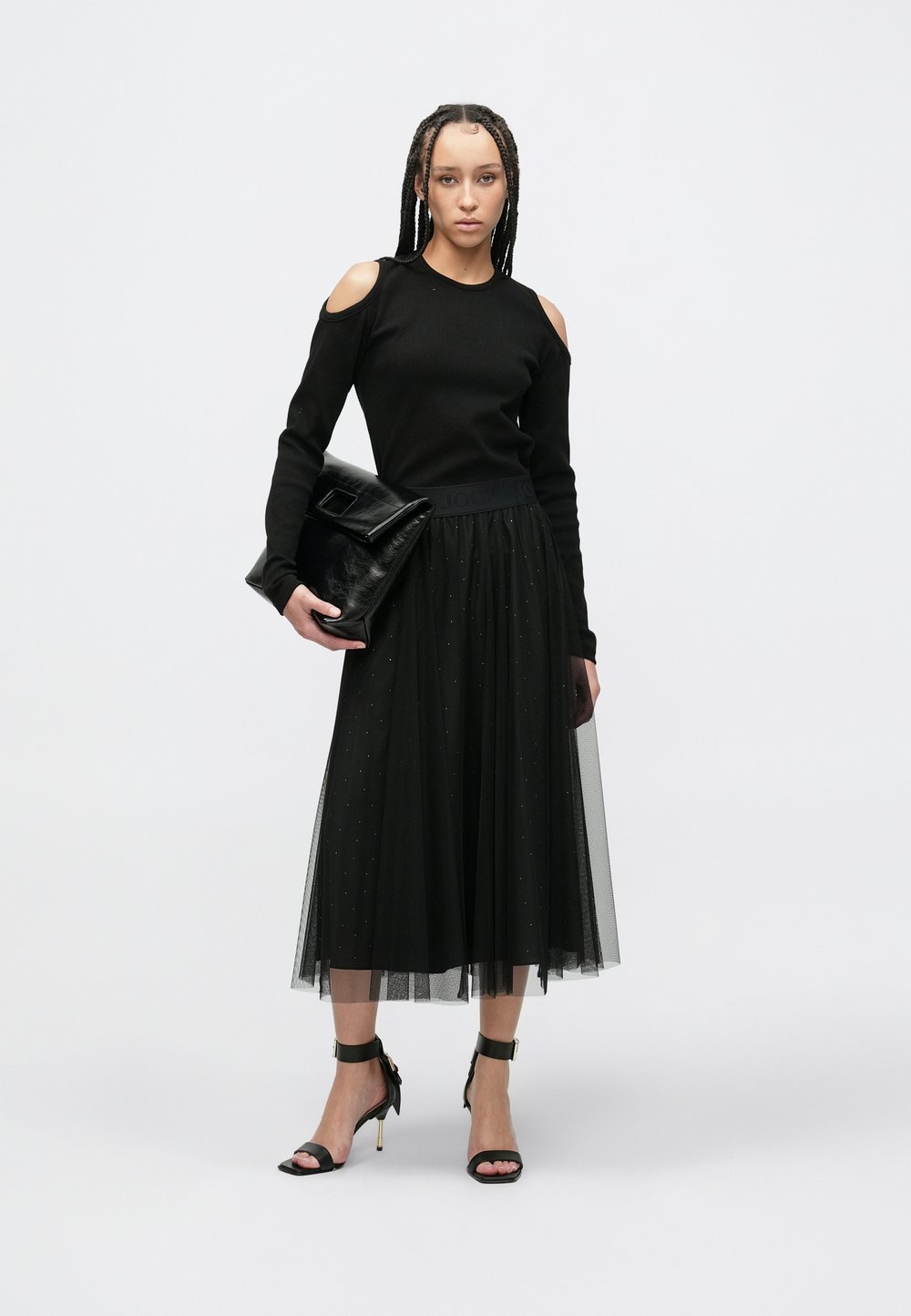 Μαύρη υπερμεγέθη φούτερ μπλούζα με στρώσεις κάτω από μια μακρύτερη μαύρη γιλέκα, σε συνδυασμό με μια φούστα με παγιέτες. Μαύρες στρατιωτικές μπότες και μια υφασμάτινη τσάντα ολοκληρώνουν την εμφάνιση.