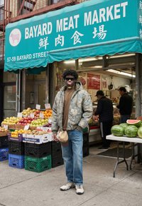 Άνδρας με κόκκινο καπέλο, μαύρο μπουφάν, λευκό πουκάμισο και φαρδιά τζιν στέκεται σε μια λιθόστρωτη οδό ανάμεσα σε παρκαρισμένα αυτοκίνητα μπροστά από κτιστά κτίρια.