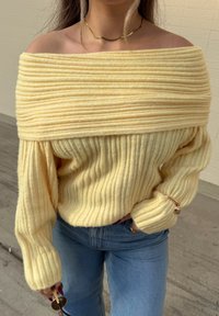 • Γυναίκα με κίτρινο πουλόβερ με ανοιχτούς ώμους και μπλε τζιν ποζάρει με σηκωμένο ένα πόδι, χαμογελώντας και φορώντας γυαλιά ηλίου μπροστά σε μια μπεζ τοίχο κάτω από το φως του ήλιου.