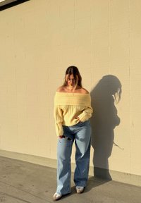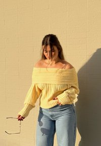 • Γυναίκα με κίτρινο πουλόβερ με ακάλυπτους ώμους και τζιν φαρδιάς γραμμής στέκεται μπροστά σε φωτισμένο από τον ήλιο μπεζ τούβλινο τοίχο, κρατώντας γυαλιά ηλίου με το ένα χέρι.