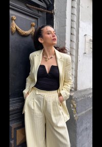 • Ανοιχτό κίτρινο κοστούμι με λεπτές ρίγες, διαμορφωμένο σακάκι και παντελόνια σε φαρδιά γραμμή, συνδυασμένα με ένα μαύρο strapless τοπ και περιδέραιο με χρυσές λεπτομέρειες.