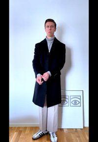 • Άνδρας που φοράει ναυτικό παλτό, γκρι ζιβάγκο, μπεζ παντελόνι και αθλητικά παπούτσια, στέκεται δίπλα σε λευκό τοίχο με κορνιζαρισμένο έργο τέχνης στο πάτωμα.