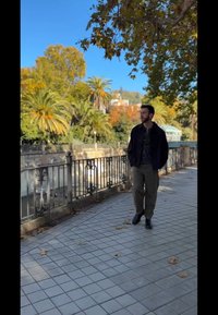 • Άνδρας που στέκεται σε πλακόστρωτο πεζοδρόμιο κοντά σε κιγκλίδωμα, φοράει μαύρο μπουφάν, πουκάμισο με καρό σχέδιο, χακί παντελόνι, περιτριγυρισμένος από φθινοπωρινά δέντρα και καθαρό γαλάζιο ουρανό.