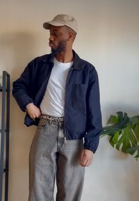 • Άνδρας που φοράει μπεζ καπέλο, ναυτικό μπουφάν, λευκό μπλουζάκι και γκρίζα τζιν, ρυθμίζοντας το μπουφάν του με φυτό και ράφι στο παρασκήνιο.