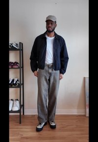 • Άνδρας με καπέλο, σκούρο μπουφάν, λευκό πουκάμισο, γκρι φαρδιά τζιν και αθλητικά παπούτσια στέκεται με σταυρωμένα χέρια κοντά σε ράφι με παπούτσια και αφηρημένο ζωγραφικό έργο.