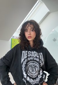 • Νεαρή γυναίκα με σγουρά μαλλιά που φοράει μαύρο φούτερ "Desigual" ποζάρει σε εσωτερικό χώρο κάτω από φεγγίτη με πολύχρωμο τοιχογραφία πίσω της.