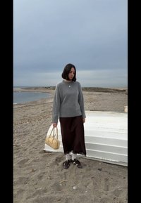 • Άτομο που φοράει γκρι πουλόβερ και σκούρα φούστα σε αμμώδες έδαφος, κρατώντας μια μπεζ τσάντα χειρός με μεταλλικά τρυπήματα και φοράει καφέ αθλητικά παπούτσια.
