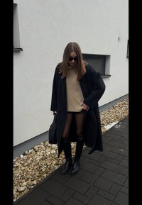 • Γυναίκα με μαύρο παλτό, μπεζ πουλόβερ με ζιβάγκο, μαύρο δερμάτινο σόρτς, μαύρες μπότες και γυαλιά ηλίου, στέκεται σε πλακόστρωτο μονοπάτι δίπλα σε λευκό κτίριο.