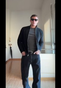 • Άνδρας που φοράει μαύρο ριμπ ζακ�έτα με φερμουάρ, γκρι εφαρμοστό μπλουζάκι, μαύρη ζώνη και μαύρα τζιν, με τα χέρια στις τσέπες, στέκεται σε πλακόστρωτο δάπεδο.